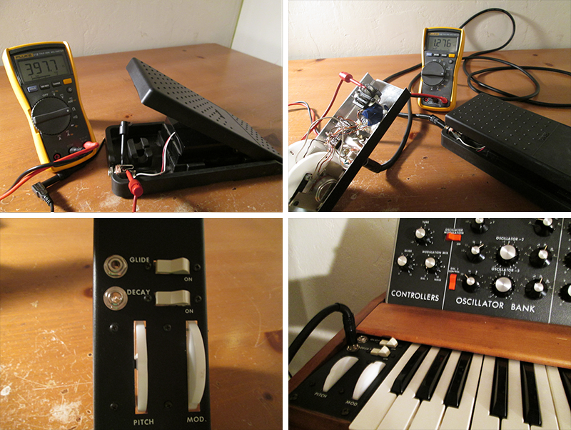 Here we modified the classic Minimoog D to have foot-pedal control of the modulation wheel using a Yamaha FC7 pedal.